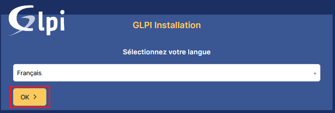 Vous arrivez sur la page du setup de GLPI. Sélectionnez le Français dans la liste déroulante et cliquez sur OK.