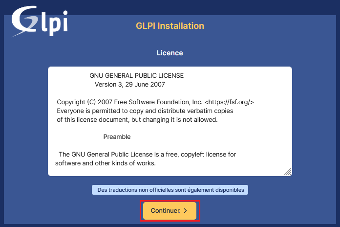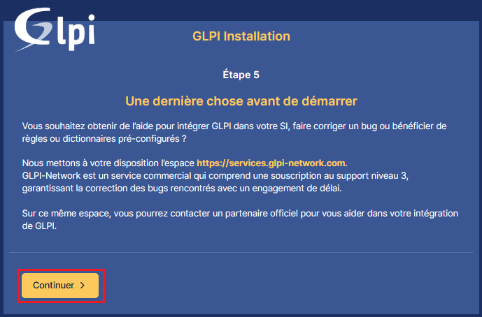 On vous informe ensuite qu’il existe un service commercial de GLPI avec accès à un support dédié si nécessaire pour votre entreprise. Cliquez sur Continuer.