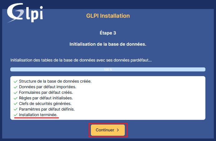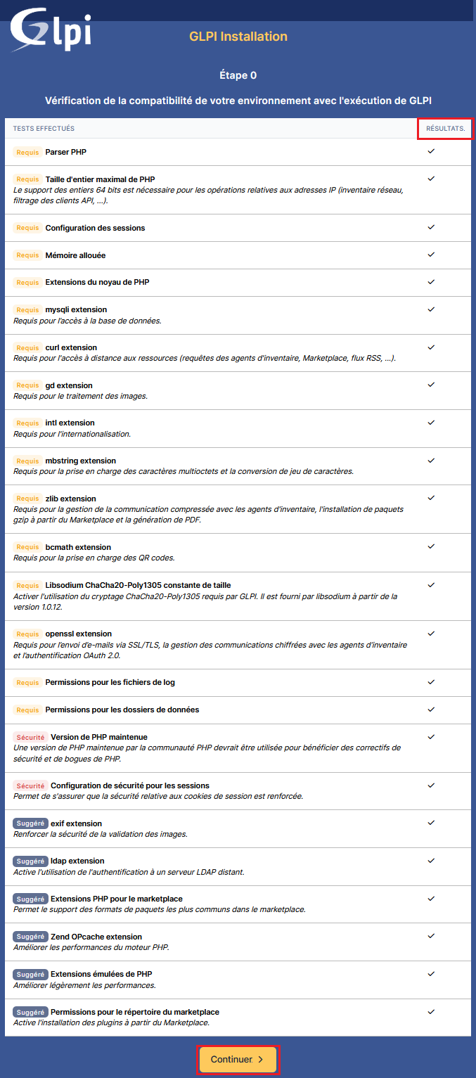 Une série de test sera lancée par le setup pour s’assurer que tous les prérequis nécessaires au bon fonctionnement de GLPI sont remplis. Si vous avez correctement suivi ce tuto, il ne devrait y avoir que des coches dans la colonne de droite. Si ce n’est pas le cas, corrigez d’abord les erreurs présentes qui peuvent être bloquantes. Quand tout est OK, cliquez sur Continuer.