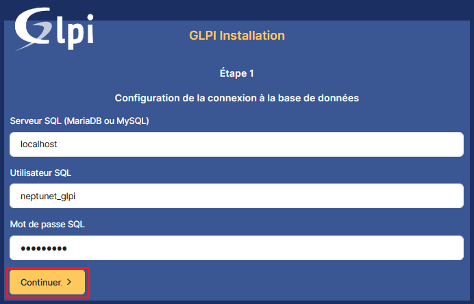 Il reste à saisir les informations sur la base de données destinée à GLPI que nous avons précédemment créée. Dans le champs Serveur SQL, saisissez localhost pour spécifier que la machine actuelle héberge à la fois le site web de GLPI et la base de données (si la base de données est stockée sur une autre machine, saisissez son adresse IP ou son nom). Saisissez ensuite le nom de votre utilisateur SQL disposant des privilèges sur cette base de données et son mot de passe.