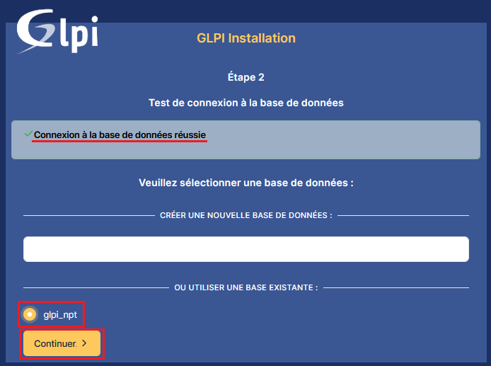 Sélectionnez la base de données dédiée à GLPI, il n’y a qu’à cliquer dans le cercle devant le nom de la base de données existante avant de continuer.
