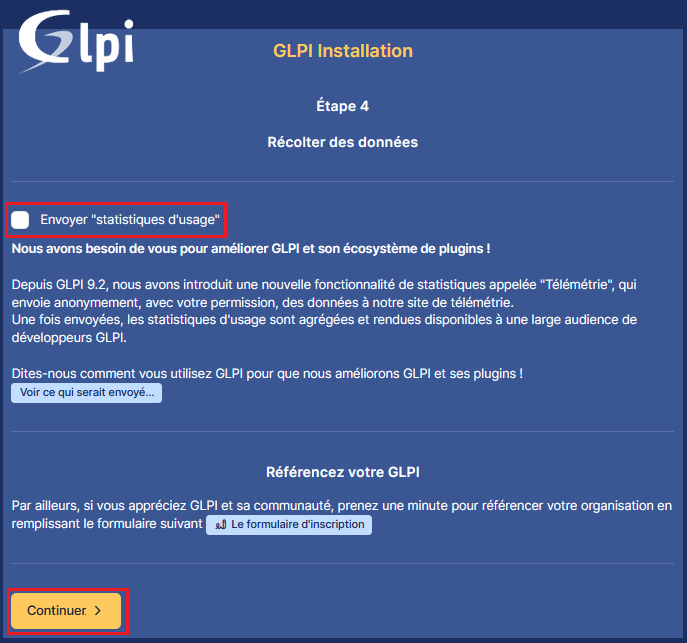 Choisissez d’envoyer ou non des statistiques sur votre utilisation de GLPI à l’équipe qui gère le projet et poursuivez.