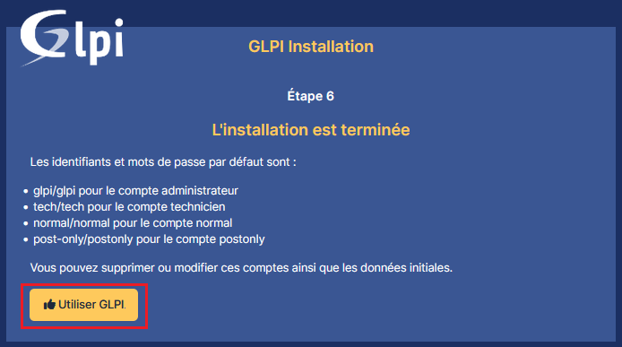 L’installation est désormais terminée. Notez bien les identifiants par défaut qui permettront de rentrer dans l’interface web de GLPI. Ils seront à changer par la suite. Cliquez sur Utiliser GLPI.