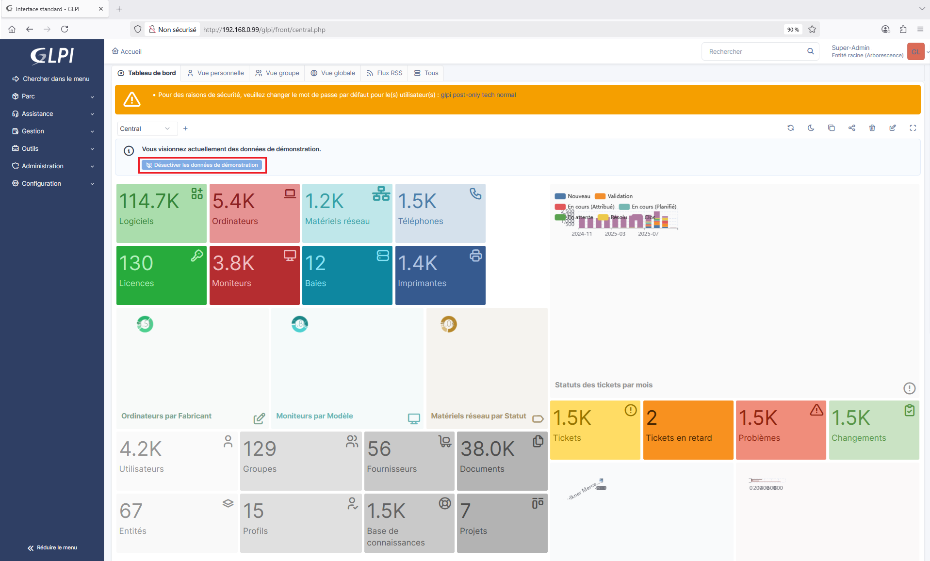 Nous sommes désormais connectés au tableau de bord de GLPI ! Vous pouvez désactiver les données de démonstrations en cliquant sur le bouton prévu à cet effet.