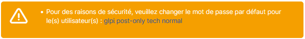 Un message d’avertissement vous informe que par sécurité il faudra changer les mots de passe par défaut des 4 utilisateurs déjà présents dans GLPI.
