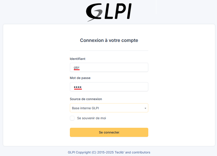 Connectez vous avec les identifiants par défaut du compte GLPI qui est le super-administrateur (user : glpi | mdp : glpi).