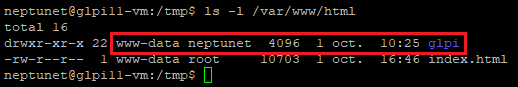 Vous pouvez vérifier que tout est OK en listant le contenu du répertoire avec la commande « ls -l /var/www/html ». Vous pourrez alors constater la présence d’un répertoire nommé « glpi » dont le propriétaire est bien l’utilisateur nommé « www-data ».