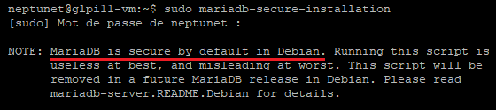 Info + : La sécurisation du service de base de données n’est plus nécessaire car désormais effectuée par défaut sous Debian. Les scripts mariadb-secure-installaion ou mysql_secure_installation seront retirés dans les prochaines versions. |