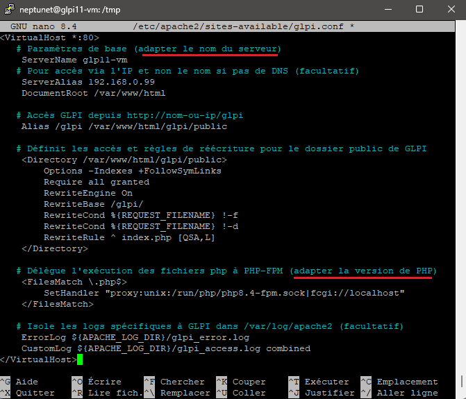 Cette prochaine étape va concerner la configuration du service web avec la création d’un fichier de configuration dédié à notre GLPI et l’activation des modules nécessaires, notamment la déclaration de l’utilisation de PHP-FPM pour apache.