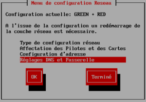 Une fois les cartes bien attribuées, vous aurez un écran comme celui ci-dessous où l’on voit bien que des cartes réseaux ont été attribués aux interfaces green pour le LAN et red pour le WAN. Descendez sur Terminé et appuyez sur Entrée.