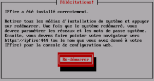 Après quelques minutes, IPFire sera installé et un message vous invitant à redémarrer la machine s’affichera à l’écran. Lisez bien ce message car il vous donne l’URL pour accéder à l’interface web d’IPFire. Appuyez sur Entrée.